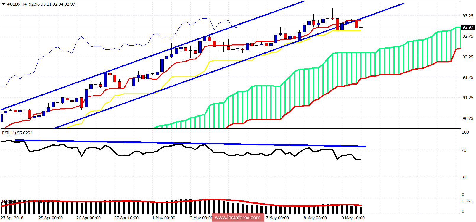 10.05.2018 08:59 AMThe Dollar index is showing reversal signs. After the bearish divergence warnings by the RSI, the price broke out and below the bullish channel. Two attempts to break above the important 93 level resistance have so far failed. The price pops up above resistance, but sellers push it back below it.