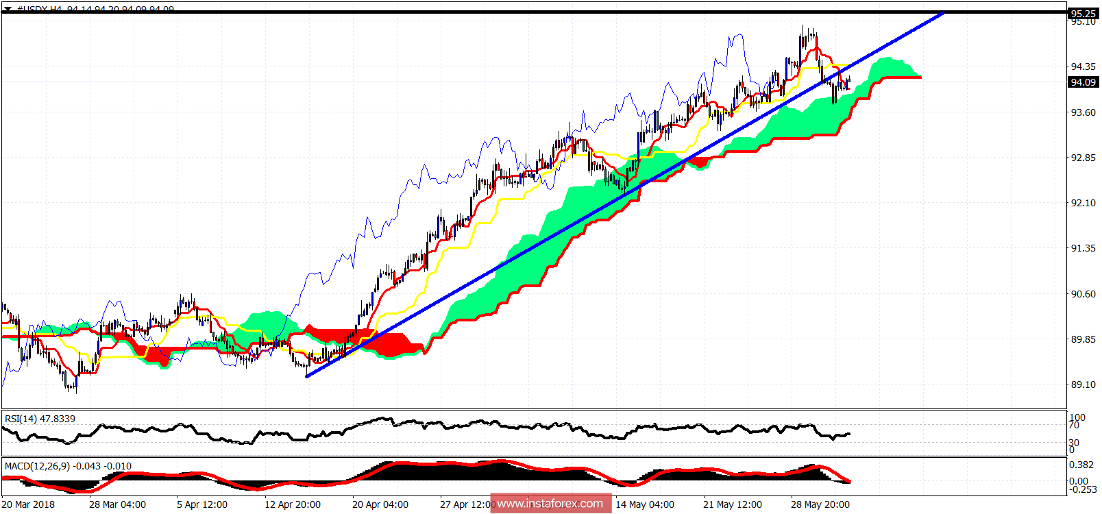 01.06.2018 09:14 AMThe Dollar index is in a bullish trend. Price pulled back from the weekly resistance at 95 and has tested successfully the 4 hour Ichimoku cloud support. As long as price is above this 4 hour support we could see a new higher high. A break below the cloud support will confirm that the top is in.