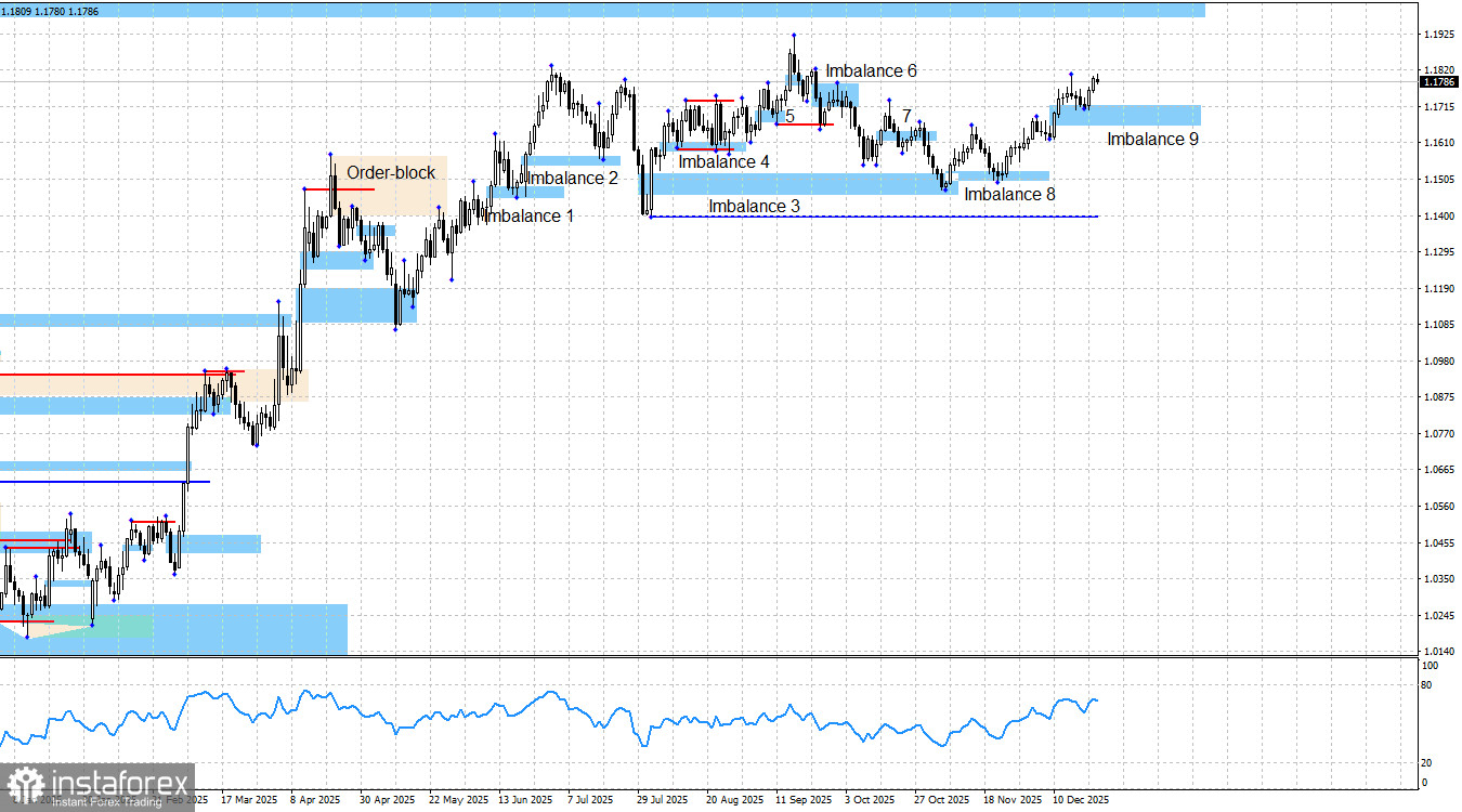 Пара EUR/USD выполнила отбой от зоны «бычьего» имбаланса 9, что дало нам еще один сигнал на покупку. Напомню, что началось всё еще с имбалансов 3 и 8, тоже «бычьих». Пара образовала два сигнала на покупку, а у трейдеров имелась прекрасная возможность зайти в продолжение «бычьего» тренда по наиболее выгодному курсу. Сейчас эта сделка на покупку находится в прибыли около 260 пунктов. Трейдеры сами могут решать, что дальше делать: ждать большей прибыли или же закрывать сделку сейчас. Лично я жду большего роста от европейской валюты. В последние месяцы я не раз обращал внимание трейдеров на очевидный факт: «бычий» тренд сохраняется. Таким образом, все это время я ждал нового наступления быков. Теперь я жду отработки пиков 2025 года и «медвежьего» имбаланса недельного графика (виден на картинке).