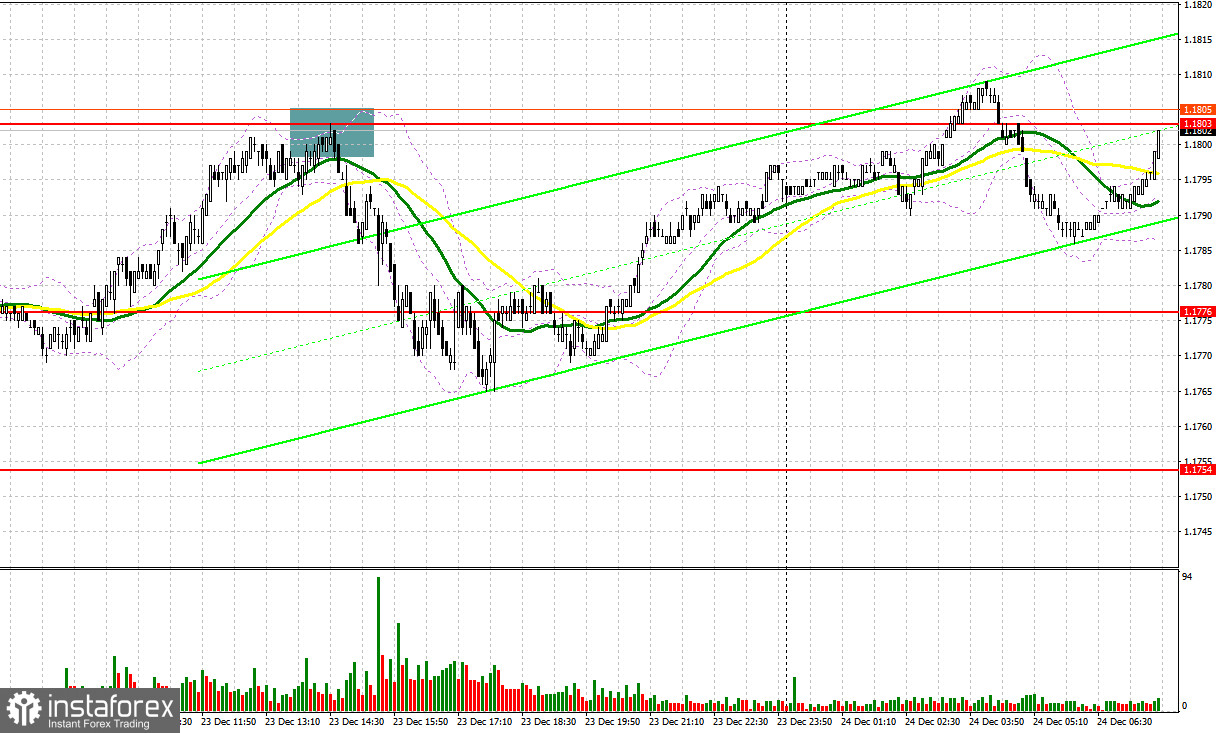 Вчера была образована лишь одна точка входа в рынок. Давайте посмотрим на 5-минутный график и разберемся с тем, что там произошло. В своем утреннем прогнозе я обращал внимание на уровень 1.1776 и планировал от него принимать решения по входу в рынок. Прорыв и 1.1776 произошел, но до обратного теста дело так и не дошло. По этой причине я остался без покупок евро. Во второй половине дня медведи проявили себя в районе 1.1802, что позволило получить хорошую точку входа на продажу евро с движением вниз более чем на 30 пунктов.