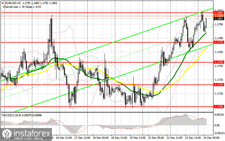 Американский доллар отреагировал вчера укреплением на новости о том, что экономика США в третьем квартале этого года продемонстрировала самый быстрый рост за два года, чему способствовали устойчивые потребительские и деловые расходы. Согласно данным, валовой внутренний продукт с поправкой на инфляцию вырос на 4,3% в годовом исчислении, что оказалось выше всех прогнозов. Однако защитить свои позиции покупатели доллара не сумели, что вылилось в очередной рост пары EUR/USD уже к закрытию американской сессии. Сегодня нет никакой статистики по еврозоне, так что не исключено, что пара продолжит свой рост далее по тренду. В случае небольшого снижения EUR/USD в рамках коррекции, первого проявления покупателей ожидаю увидеть в районе поддержки 1.1775, образованной по итогам вчерашнего дня. Лишь после формирования там ложного можно получить точку входа в длинные позиции с целью восстановления в район 1.1807, где сейчас и ведется торговля. Прорыв и обратный тест этого диапазона по аналогии с тем, что я разбирал выше, станут подтверждением правильных действий на покупку евро уже в расчете на более крупный рывок к 1.1840. Самой дальней целью выступит максимум 1.1882, где буду фиксировать прибыль. Тест этого уровня укрепит бычий рынок по евро. При варианте снижения EUR/USD, и отсутствия активности в районе 1.1775, давление на пару усилится, что может привести к более крупному движению евро вниз. В таком случае медведи попытаются дотянуться до следующего интересного уровня 1.1754. Лишь формирование там ложного пробоя будет подходящим условием на покупку евро. Открывать длинные позиции сразу на отскок будут от 1.1729 с целью восходящей коррекции в 30-35 пунктов внутри дня.