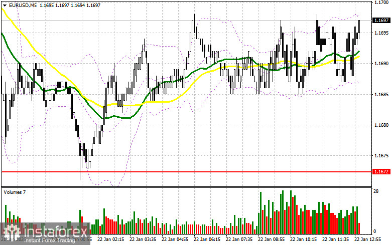 В своем утреннем прогнозе я обращал внимание на уровень 1.1672 и планировал от него принимать решения по входу в рынок. Давайте посмотрим на 5-минутный график и разберемся с тем, что там произошло. Снижение произошло, но из-за низкой волатильности до теста этого уровня дело так и не дошло, так что я остался без сделок. На вторую половину дня техническая картина не пересматривалась.