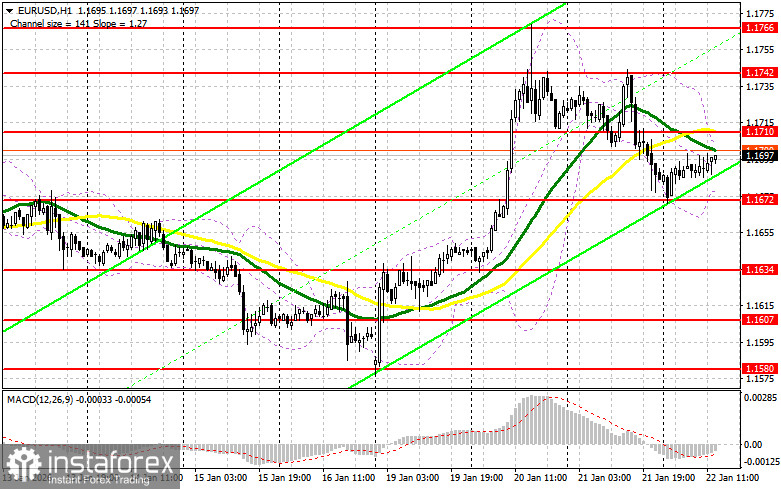 Учитывая неопределенность, с которой сейчас столкнулись валютные трейдеры, а также отсутствие какой-либо реакции на протокол заседания Европейского центрального банка, нет ничего удивительного в том, что трейдеры не проявили никакой активности. Далее все будет решаться американской статистикой. Ожидаются цифры по числу первичных обращений за пособием по безработице, изменению объема ВВП за третий квартал 2025 года, основному индексу расходов на личное потребление, а также уровню расходов и доходов населения США. Хорошие отчеты станут очередным поводом для продажи евро – особенно в свете более мягкой позиции Трампа по Гренландии и отказа от пошлин. В случае давления на пару EUR/USD, только формирование ложного пробоя в районе ближайшей поддержки 1.1672 даст точку входа в длинные позиции в расчете на продолжение развития нового бычьего рынка с ростом к сопротивлению 1.1710. Прорыв и обратный тест этого диапазона сверху вниз станут подтверждением правильной точки вход с движением к области 1.1742. Самой дальней целью будет уровень 1.1766, где буду фиксировать прибыль. При варианте снижения EUR/USD и отсутствия активности в районе 1.1672, евро может просесть более крупно. Это приведет к снижению в район 1.1634. Лишь после формирования там ложного пробоя собираюсь действовать на покупку евро. Открывать длинные позиции сразу на отскок планирую от 1.1607 с целью восходящей коррекции в 30-35 пунктов внутри дня.