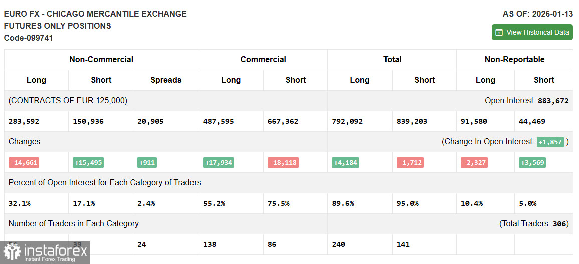 В COT-отчете (Commitment of Traders) за 13 января наблюдался рост коротких позиций и сокращение длинных. Очевидно, что в этом отчете не отражены новые геополитические разногласия между США и ЕС за Гренландию, которые привели к существенному изменению расстановки сил в рынке. Сейчас все внимание трейдеров смещено именно на эту проблему. Что касается денежно-кредитной политики, то она пока отодвинута на второй план, так как вряд ли на следующей неделе ФРС будет что-то в ней менять. В COT-отчете указано, что длинные некоммерческие позиции сократились на 14 661 до уровня 283 592, в то время как короткие некоммерческие позиции выросли на 15 495 до уровня 150 936. В результате спрэд между длинными и короткими позициями вырос на 911.