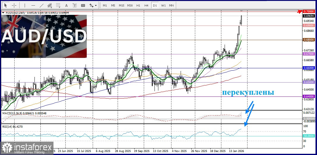 27.01.2026 17:56Сегодня во вторник на момент написания пара AUD/USD стремится к круглому уровню 0,7000, поднявшись на 0,70% за день. Пара по-прежнему поддерживается сочетанием сильных внутренних фундаментальных факторов в Австралии и сохраняющейся слабостью доллара США.