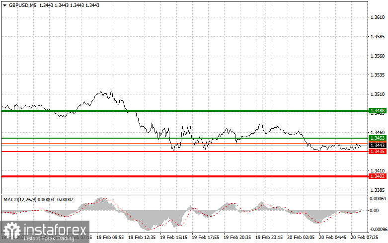 Сценарий №2: покупать фунт сегодня также планирую в случае двух подряд тестов цены 1.3435 в момент, когда индикатор MACD будет находиться в области перепроданности. Это ограничит нисходящий потенциал пары и приведет к обратному развороту рынка вверх. Можно ожидать рост к противоположным уровням 1.3453 и 1.3488.