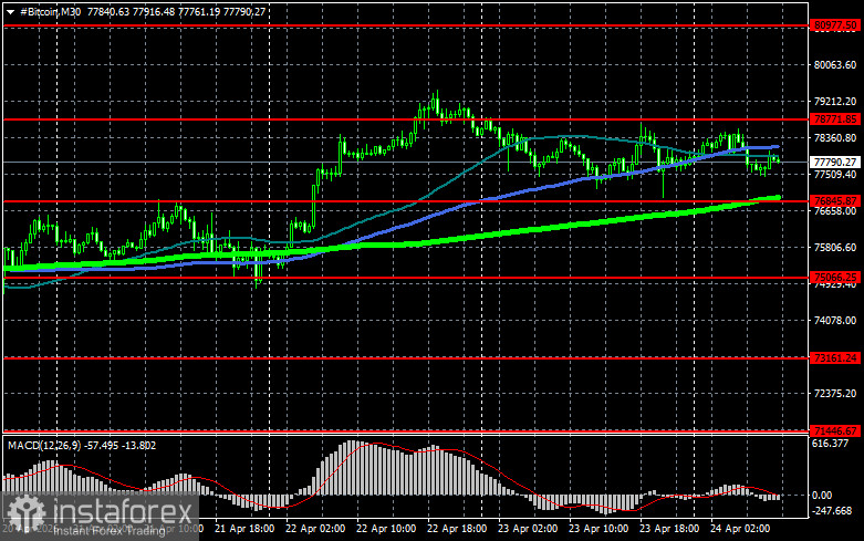 Что касается технической картины Bitcoin, то покупатели сейчас нацелены на возврат уровня $78 700, который открывает прямую дорогу на $80 900, а там уже и рукой подать до уровня 83 100. Самой дальней целью выступит максимум в районе $85 600, преодоление которого будет означать попытки возврата бычьего рынка. В случае падения биткоина покупателей жду на уровне $76 800. Возврат торгового инструмента под эту область может быстро свалить BTC в район $75 000. Самой дальней целью будет область $73 100.