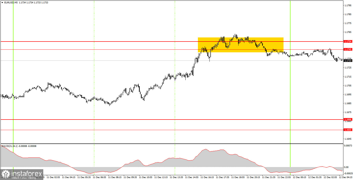На 5-минутном ТФ первый торговый сигнал вчера был сформирован на американской торговой сессии. Цена достигла область сопротивления 1,1745-1,1754 и не смогла продолжить рост. По состоянию на утро пятницы можно сказать, что цена отскочила от этой области. Предыдущий же сигнал на покупку был сформирован еще в среду вечером. Те трейдеры, которые открыли по нему длинные позиции, получили прибыль около 60 пунктов.