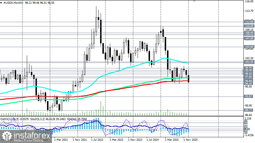 А пока что доллар остается под давлением, в то время как его индекс USDX продолжает снижаться, пробив стратегический уровень поддержки 96.80 (ЕМА200 на месячном графике) и двигаясь в сторону минимумов с марта 2022 года, достигнутых вблизи отметки 96.20.