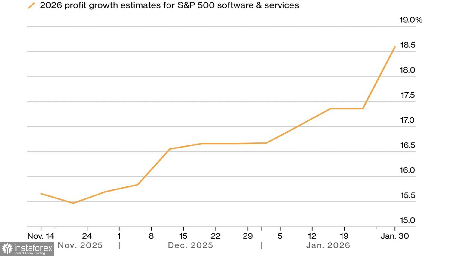 С фундаментальной точки зрения, и состояние экономики США, и корпоративные доходы остаются сильными. В том числе у производителей программного обеспечения. Уолл-стрит ожидает роста их прибыли на 19% в 2026. Вполне приличная цифра, чтобы позволить акциям расти.