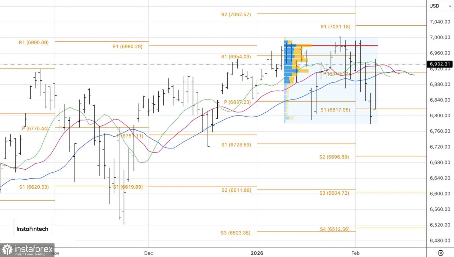 Технически на дневном графике S&P 500 имел место прорыв динамических сопротивлений в виде комбинации скользящих средних снизу вверх. Это свидетельствует о восстановлении контроля со стороны «быков» и возможности покупок выше 6910.