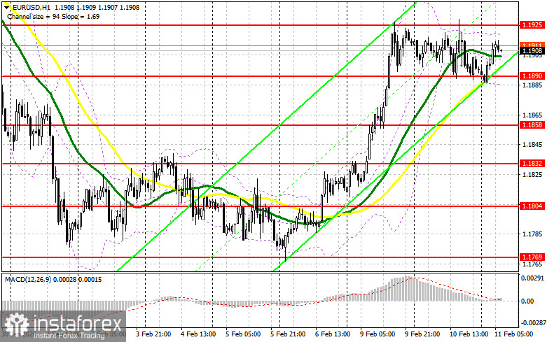 Продавцы пока активно защищают недельный максимум, но все может измениться после выхода данных по рынку труда США, о которых мы подробней поговорим в прогнозе на вторую половину дня. Пока же медведям необходимо защищать сопротивление 1.1925, упустив которое развитие бычьего рынка продолжится. Только формирование ложного пробоя в районе 1.1925 даст точку входа в короткие позиции с целью движения к поддержке 1.1890, где проходят средние скользящие, играющие на стороне быков. А вот прорыв и закрепление ниже 1.1890, а также обратный тест снизу вверх, позволят добиться более крупной распродажи евро. Это станет дополнительным вариантом на открытие коротких позиций с движением в район 1.1858. Самой дальней целью выступит область 1.1832, где буду фиксировать прибыль. В случае движения вверх EUR/USD, а также отсутствия активных действий медведей в районе 1.1925, евро получит шанс на дальнейшее восстановление. В таком случае короткие позиции лучше всего отложить до более крупного уровня 1.1957. Продавать там будут только после неудачного закрепления. Открывать короткие позиции сразу на отскок я планирую от 1.1995 с целью нисходящей коррекции в 30-35 пунктов.