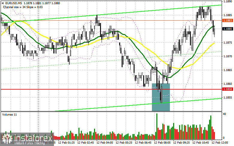 В своем утреннем прогнозе я обращал внимание на уровень 1.1858 и планировал от него принимать решения по входу в рынок. Давайте посмотрим на 5-минутный график и разберемся с тем, что там произошло. Снижение и формирование ложного пробоя в районе 1.1858 привели к точке входа на покупку евро, что вылилось в рост пары на 30 пунктов. На вторую половину дня техническая картина не пересматривалась.