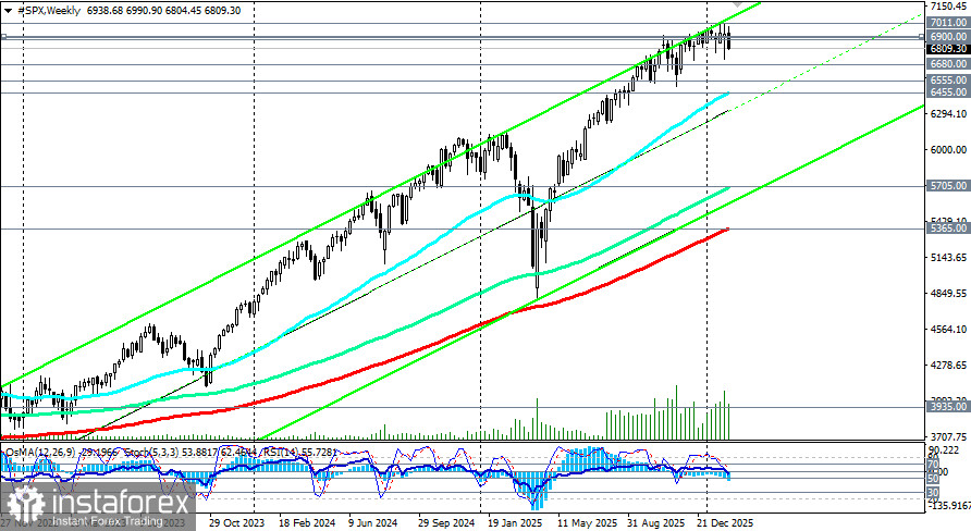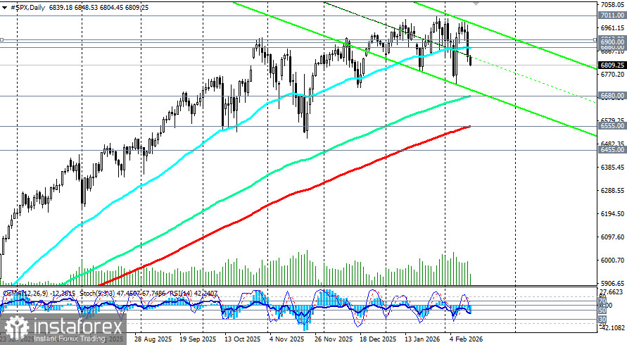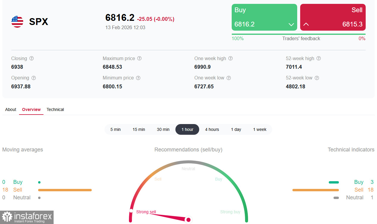 С технической точки зрения S&P500 находится на перепутье. Недавний пробой уровня поддержки 6880.00 оказался ложным — индекс быстро вернулся в диапазон 6880.00 – 7000.00. Однако для возобновления устойчивого восходящего тренда индексу необходимо закрепиться выше 7050.00 пунктов. Это открыло бы дорогу к целям 7300.00 - 7400.00 (подробнее см. в S&P500 (SPX): сценарии динамики на 13.02.2026).