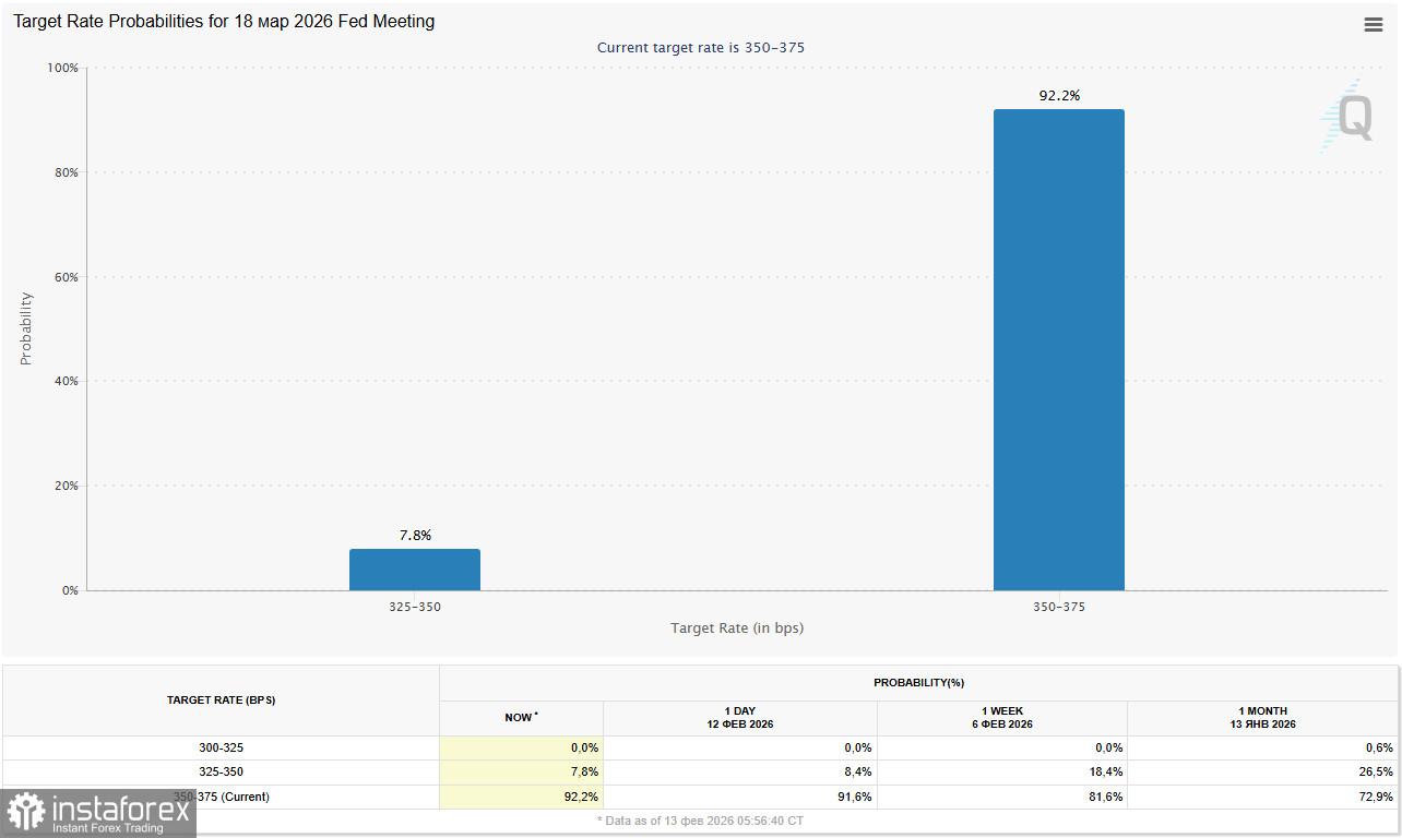 Инструмент CME FedWatch Tool показывает, что вероятность сохранения ставки без изменений в марте оценивается в 92,0%, а первое снижение теперь ожидается не ранее июня с вероятностью около 47-50%.