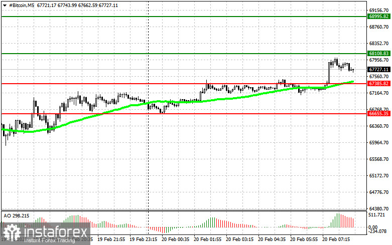 Сценарий №2: покупать биткоин можно от нижней границы $67 300 при отсутствии рыночной реакции на ее пробой в обратную сторону к уровням $68 100 и $68 900.