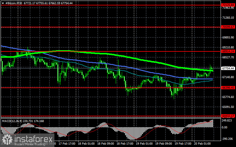 Что касается технической картины Bitcoin, то покупатели сейчас нацелены на возврат уровня $68 900, который открывает прямую дорогу на $70 600, а там уже и рукой подать до уровня 71 125. Самой дальней целью выступит максимум в районе $74 600, преодоление которого будет означать попытки возврата бычьего рынка. В случае падения биткоина покупателей жду на уровне $66 400. Возврат торгового инструмента под эту область может быстро свалить BTC в район $64 400. Самой дальней целью будет область $62 600.