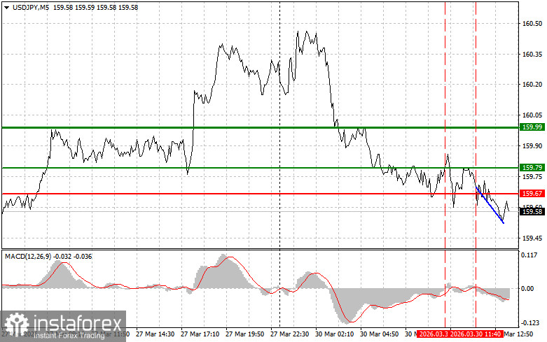 Сценарий №2: продавать USD/JPY сегодня также планирую в случае двух подряд тестов цены 159.70 в момент, когда индикатор MACD будет находиться в области перекупленности. Это ограничит восходящий потенциал пары и приведет к обратному развороту рынка вниз. Можно ожидать снижения к противоположному уровню 159.48 и 159.18.