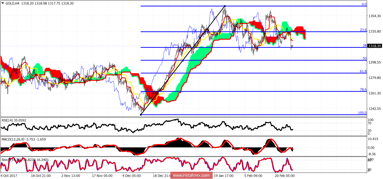El precio del oro est operando por debajo de la resistencia de la nube en el grfico de 4 horas. La tendencia a corto plazo es bajista mientras el precio est por debajo de $1,337. Nuestro siguiente objetivo ms probable est ahora en el retroceso Fibonacci 61.8% a $1,285. Este también es el siguiente soporte importante. La resistencia est en $1,325-26. Este es el primer obstculo que los toros debern superar, pero el ms importante est en $1,337.