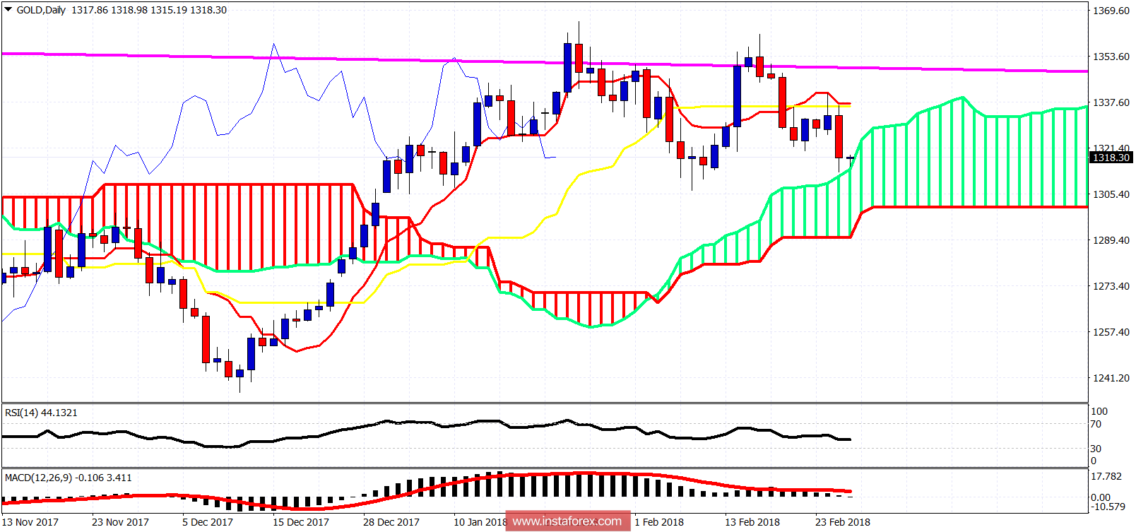 28.02.2018 03:37 PMEl precio del oro se rompió por debajo del soporte ayer después de que una ola de fuerza en el dólar fue el resultado del testimonio del nuevo presidente de la Fed. El oro est haciendo mínimos ms bajos y mximos ms bajos. El precio fue rechazado por la resistencia a la nube, pero aún se mantiene por encima del rea de soporte de $1,310-07.