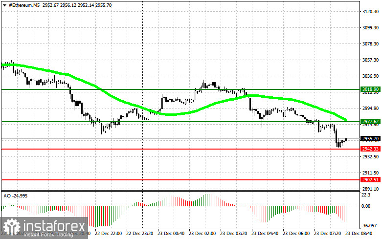 Сценарий №2: покупать эфир можно от нижней границы $2942 при отсутствии рыночной реакции на ее пробой в обратную сторону к уровням $2977 и $3018.