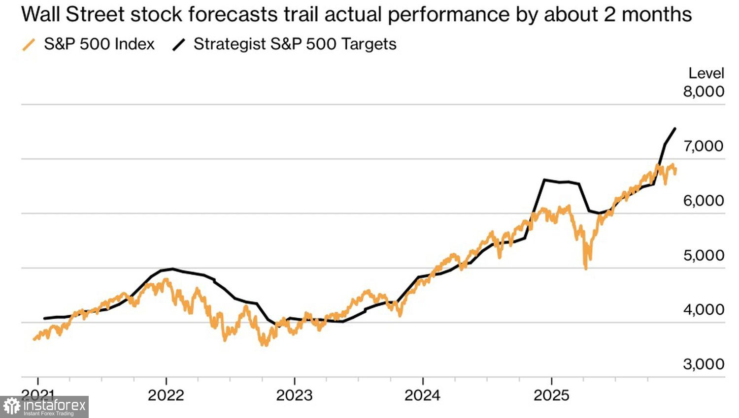 Рождество. Время прогнозов. Ни у кого нет хрустального шара, и аналитики Уолл-стрит пытаются сделать невозможное. Предсказать будущее S&P 500 в условиях геополитических конфликтов, стремления Дональда Трампа изменить мир и подмять под себя ФРС. В условиях зависимости широкого фондового индекса от горстки крупных компаний. Однако попытка, как известно, не пытка. По данным Piper Sandler, прогнозы, как правило, отстают от фактических значений на два месяца. Важны не конкретные цифры, значение имеет направление?