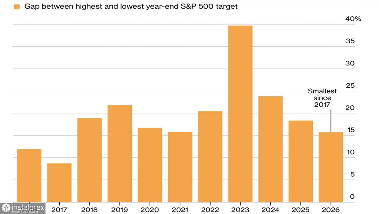 Однако эти драйверы уже во многом учтены в котировках S&P 500, как и тема технологий искусственного интеллекта. Этими козырями машут большинство аналитиков Уолл-стрит. А когда все в одной лодки, не требуется рецессии, чтобы ее перевернуть. Достаточно каких-либо разочарований по корпоративным доходам или по макростатистике, чтобы спровоцировать взлет волатильности и запустить коррекцию широкого фондового индекса. Действительно, разбежка между самым «бычьим» и самым «медвежьим» прогнозом составляет всего 16 п.п. Речь идет о минимальной разнице с 2017.