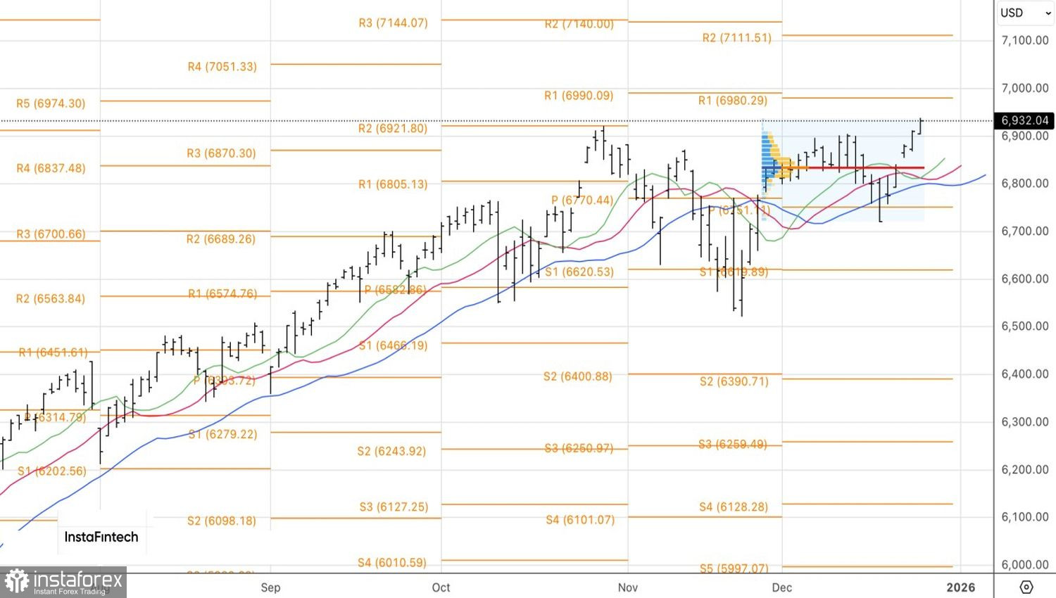 Технически на дневном графике S&P 500 имеет место рост котировок на протяжении четырех торговых сессий подряд с восстановлением тренда и выходом на рекордные пики. Рынок уверенно двигается к пивот-уровням на 7000 и 7100. Пока широкий фондовый индекс торгуется выше ключевой поддержки в виде справедливой стоимости на 6830, следует сохранять акцент на покупки.