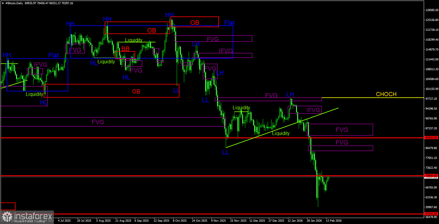 На дневном ТФ биткоин продолжает формирование нисходящей тенденции. Структура тренда идентифицируется, как нисходящая, а линия CHOCH в данное время проходит на уровне 97 900$. Только выше этого уровня можно будет считать, что нисходящий тренд завершен. Напомним, что сигнал на продажу был сформирован внутри «медвежьего» FVG(96 900$ – 98 000$) и получил подтверждение на младшем ТФ. Таким образом, трейдеры имели прекрасную возможность забрать практически все последнее движение вниз. Текущей целью остается уровень 57 500$ – 61,8% по Фибоначчи. Так как признаков разворота нет, мы считаем, что падение будет продолжено. На дневном ТФ ближайшая область POI для новых сделок на продажу находится в диапазоне 79 500$ – 81 100$, но до нее биткоину еще нужно добраться.