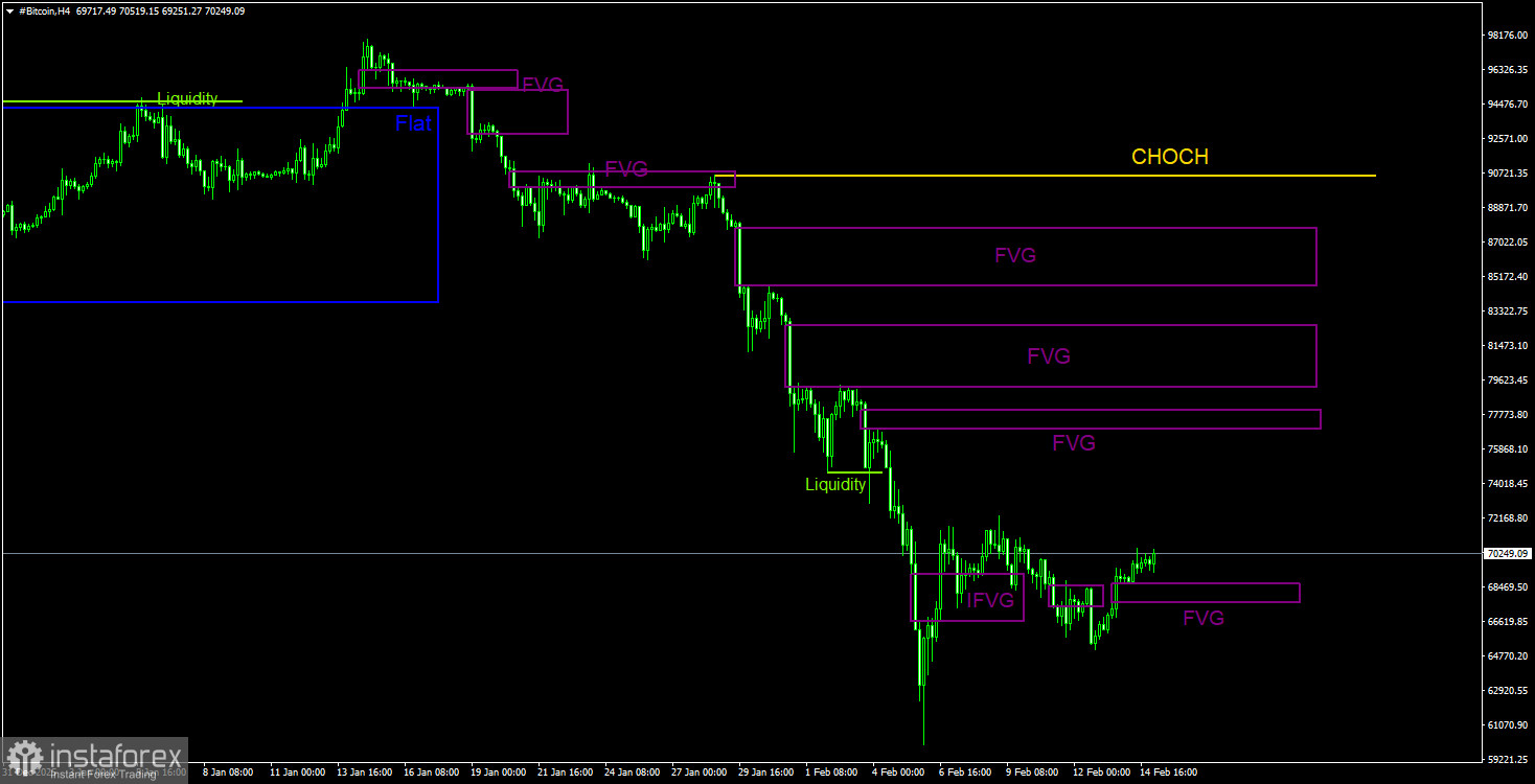 На 4-часовом таймфрейме цена также продолжает формирование нисходящей структуры. Линия CHOCH проходит на уровне 90 560$, только выше нее можно будет говорить о преобразовании тренда в восходящий. Однако на данный момент нет никаких признаков того, что биткоин может завершить падение в ближайшее время. «Бычий» паттерн IFVG не дал никакой ощутимой реакции. Единственный «медвежий» паттерн реакции тоже не дал. Вчера был сформирован новый «бычий» FVG, который теоретически может спровоцировать новый, небольшой виток роста «цифрового золота».