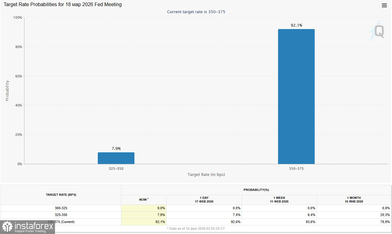 Пока что, согласно инструменту CME FedWatch Tool, вероятность сохранения ставки в диапазоне 3,50–3,75% на мартовском заседании (18 марта) оценивается в 92,1%, а первого снижения ставки в июне составляет примерно 52,0%. Инвесторы же закладывают в цены два или даже три снижения стоимости заимствований в 2026 году.