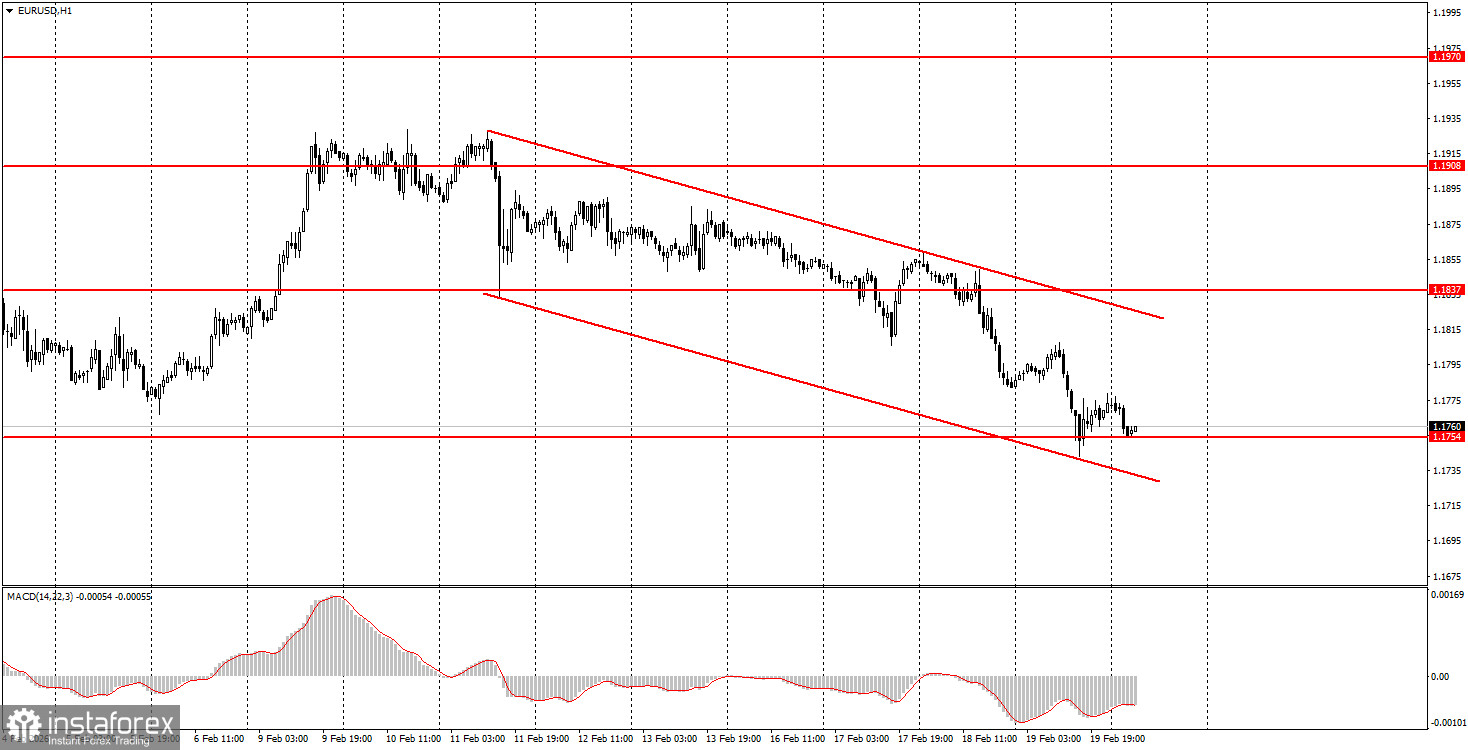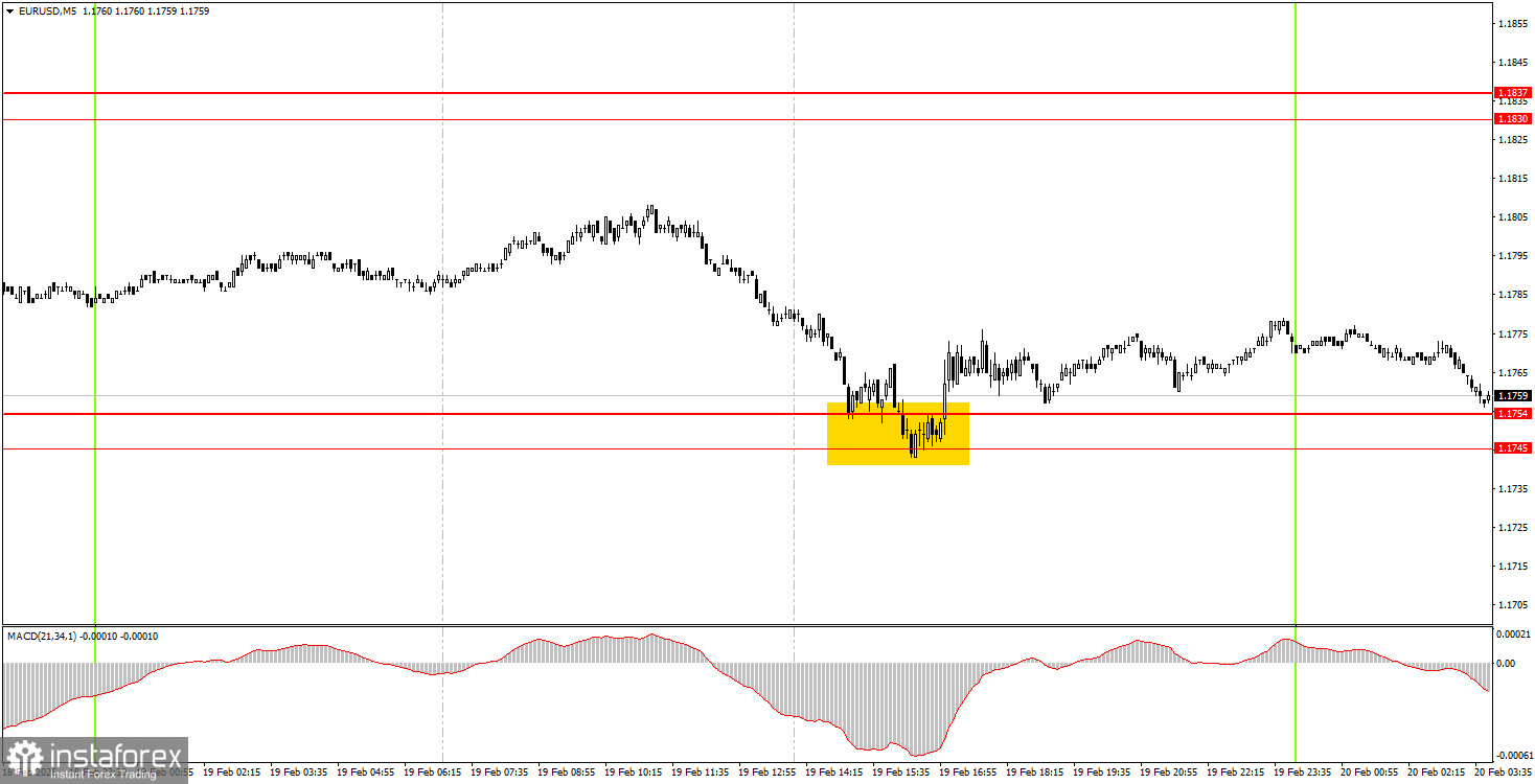 На 5-минутном ТФ в четверг был сформирован только один торговый сигнал. На американской торговой сессии пара отработала и отскочила от области 1,1745-1,1754. Рост котировок после этого сигнала был очень слабый, а пришла цена к указанной области после сигнала на продажу, сформированного в среду около области 1,1830-1,1837.